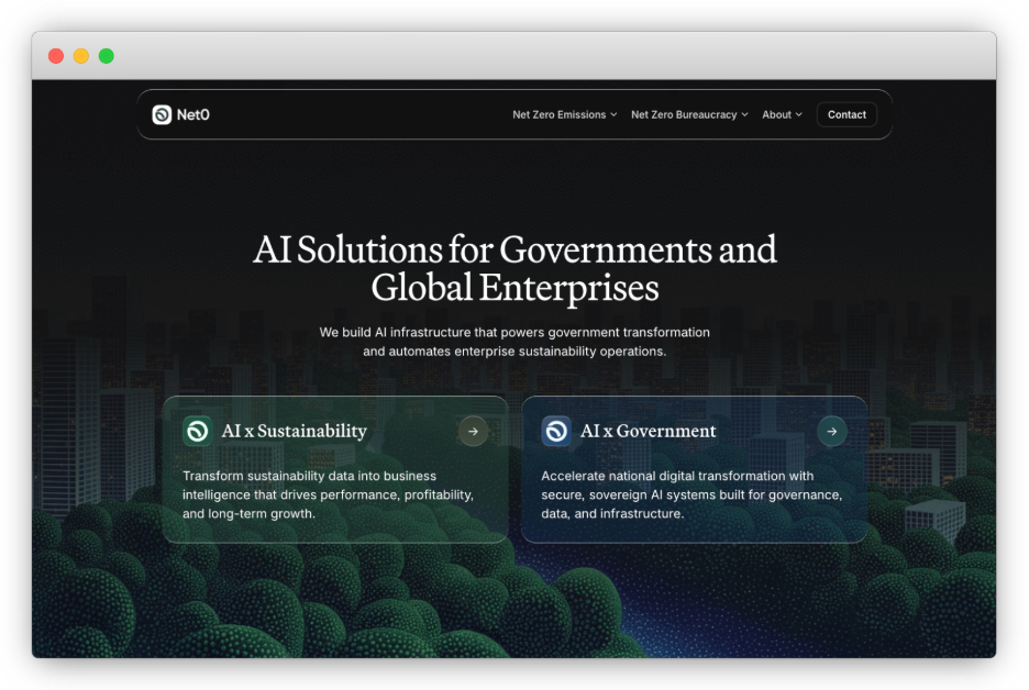 Net0 positions itself as an AI‑native sustainability and carbon accounting platform for governments and enterprises, with offices in Dubai. Its product positioning emphasizes automated data collection, audit-ready datasets, and dashboards spanning emissions and broader ESG reporting frameworks.