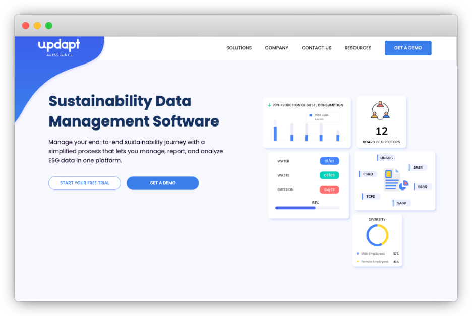 Updapt positions itself as an ESG and sustainability data management software provider with modules spanning ESG reporting and net‑zero/emissions management, and it lists a Dubai office location alongside other global offices.